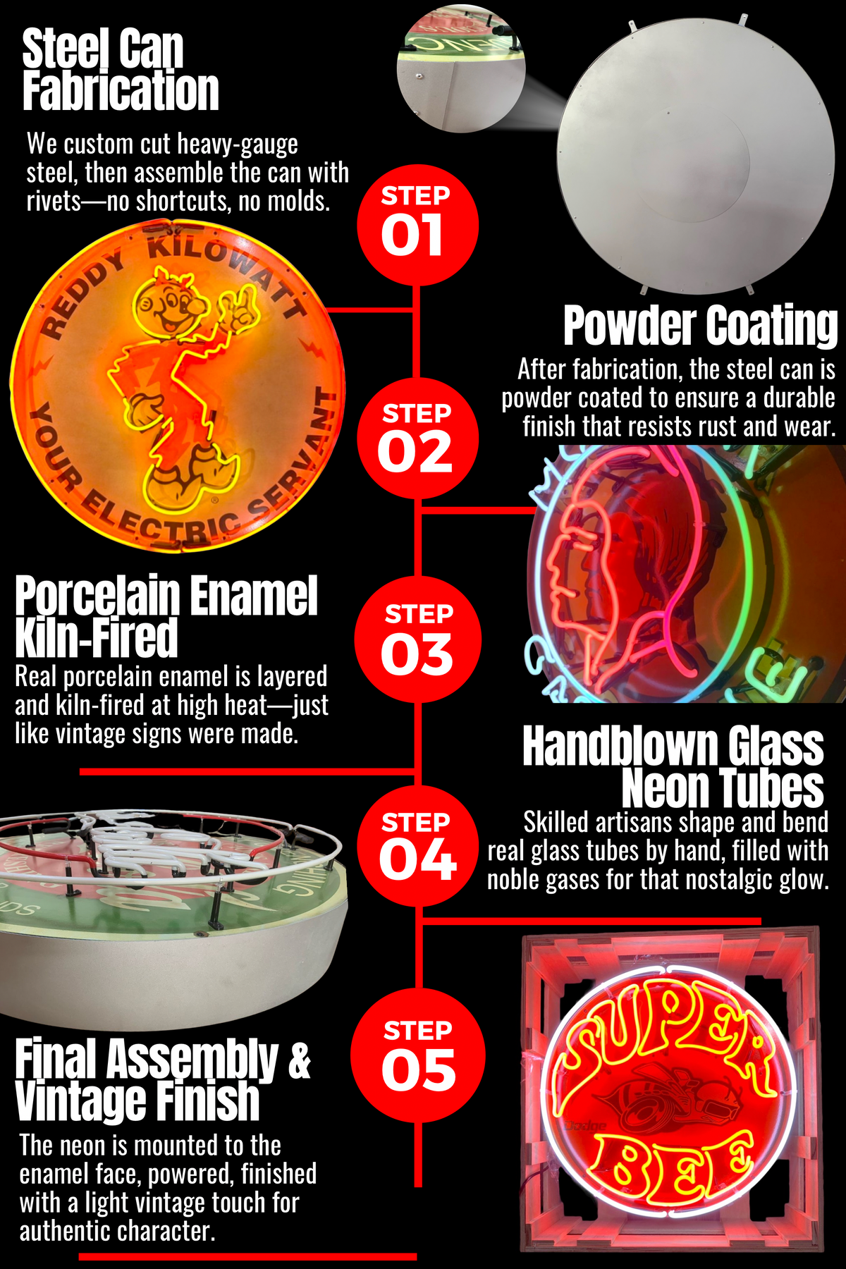 Every neon porcelain sign is proudly made in the USA with traditional methods; cut steel, kiln-fired enamel, bent glass tubes. No shortcuts—ever.