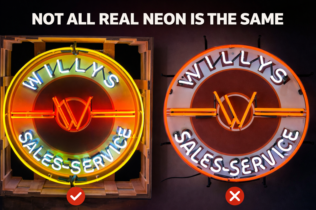 Most “custom neon” signs today aren’t neon at all. They’re plastic LED tubes made to imitate the look—but they don’t have the depth, warmth, or weight of a real neon sign, and they don’t belong in a garage built around authenticity.