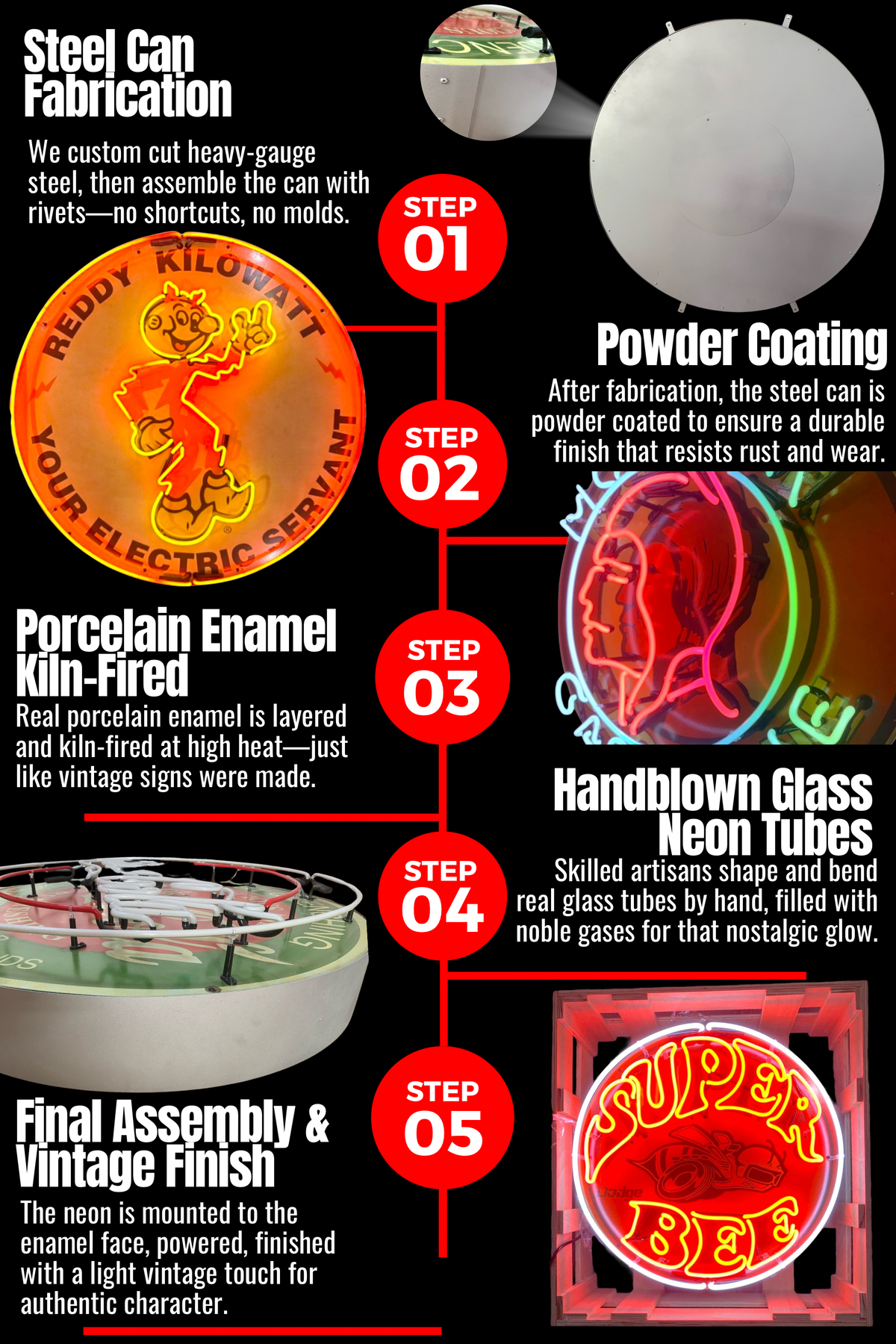 Each neon sign is handmade from scratch using hand-blown glass, porcelain enamel, and heavy steel cans—all of which are notoriously frustrating to work with.