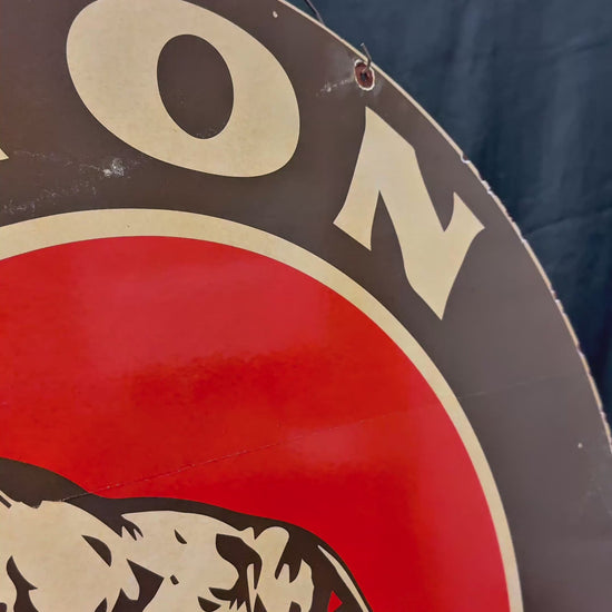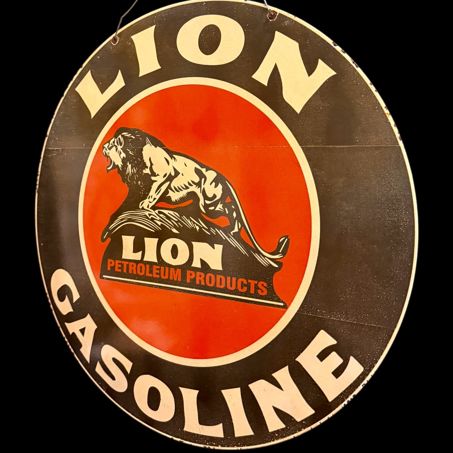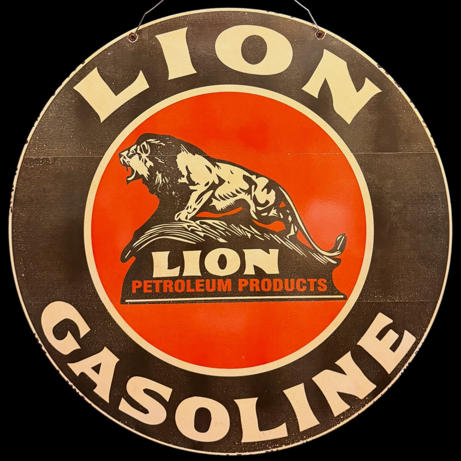 The fierce, roaring lion of the Lion Petroleum Products brand defined the bold personality of early American gas stations. This 30-inch double-sided porcelain enamel sign faithfully recreates that power and style, featuring deep, kiln-fired color on heavy-gauge steel and artwork on both sides. It captures everything collectors love about genuine porcelain advertising — weight, gloss, and authenticity.