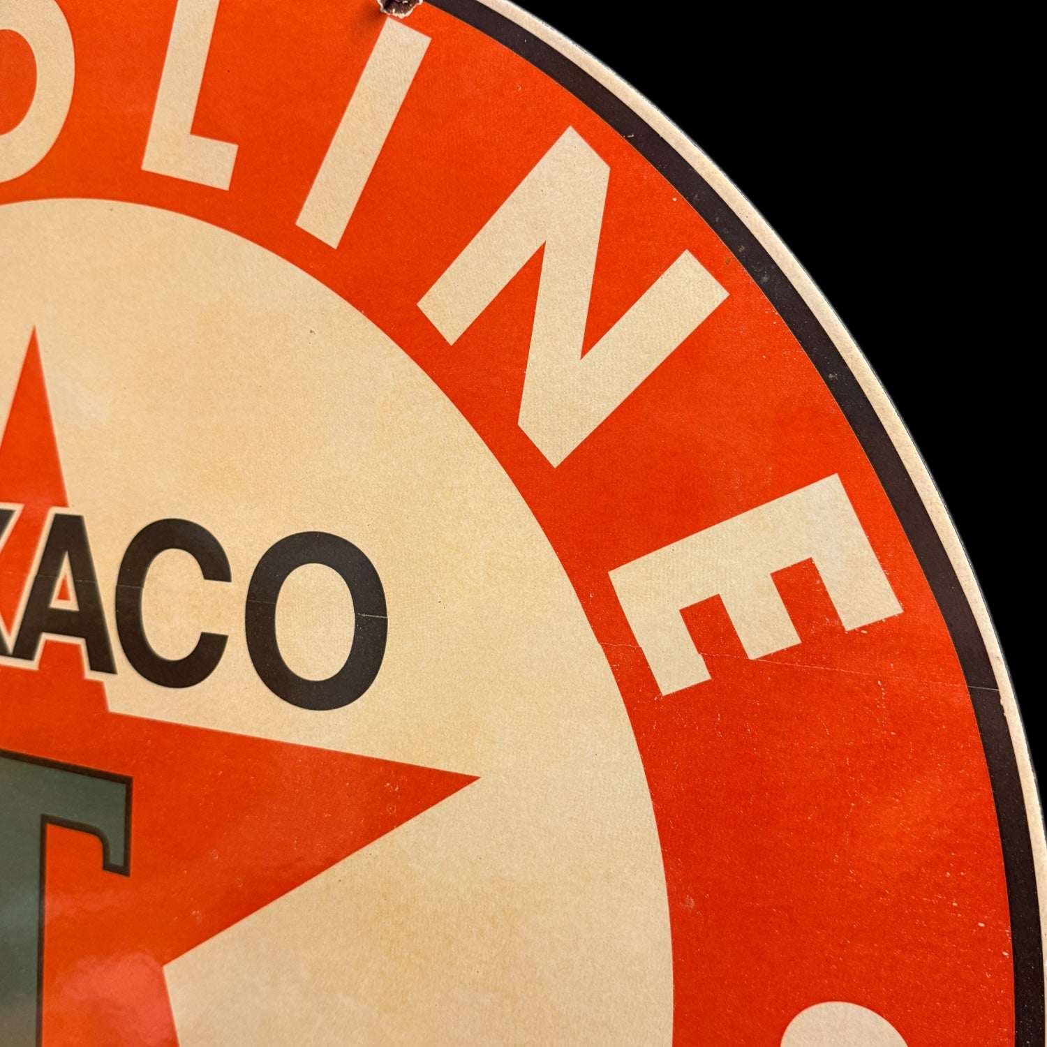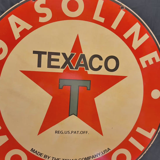 The unmistakable Texaco star — one of the most iconic emblems in American petroleum history — returns in this faithful 30-inch double-sided porcelain enamel recreation. Crafted from heavy-gauge steel and kiln-fired for lasting color and gloss, this piece captures the strength and simplicity that made Texaco signs a staple across service stations for decades.