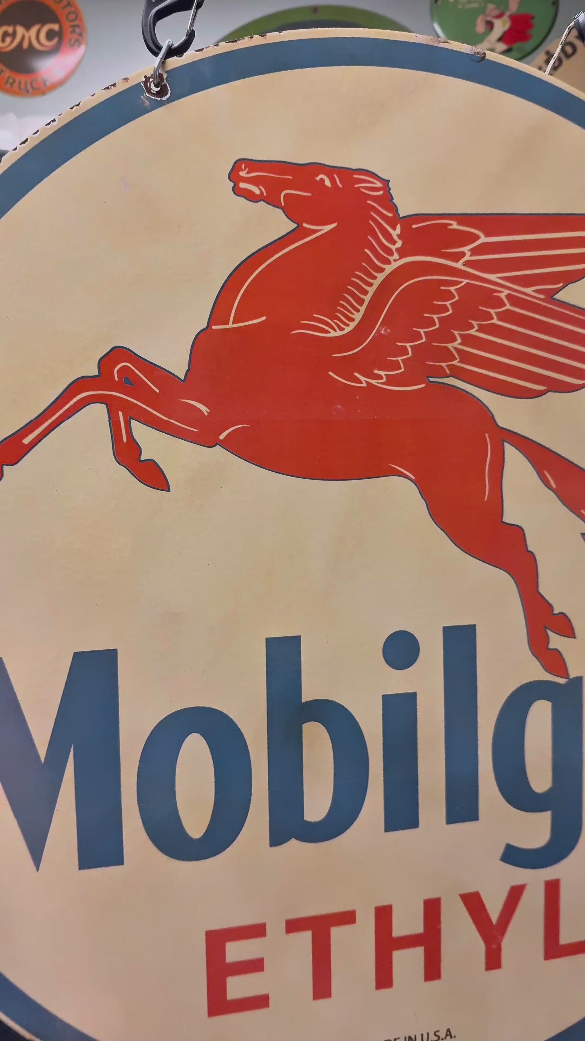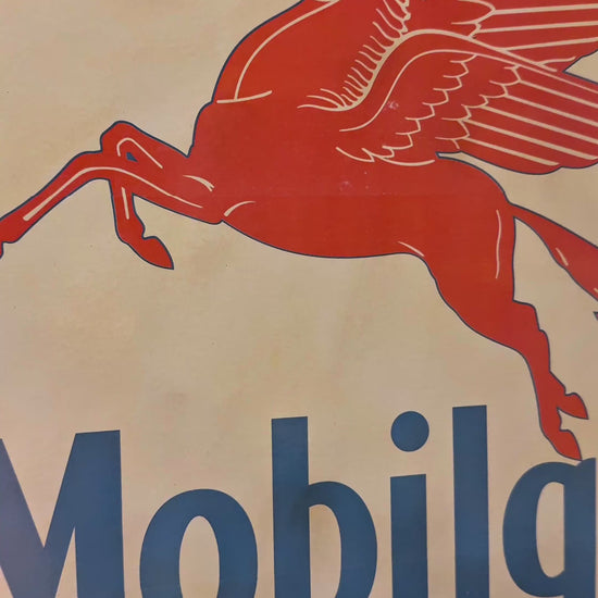Featuring the iconic red Pegasus in full flight, this 30-inch Mobilgas Ethyl sign captures one of the most recognizable images in gas & oil history. Each piece is crafted from heavy-gauge steel and kiln-fired on both sides for lasting color and authentic gloss — built to look and feel like the original station signs that once marked the golden age of the open road.