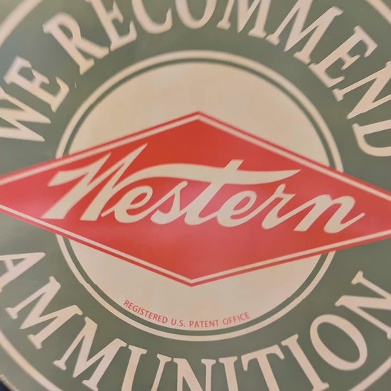 An authentic recreation of the vintage “We Recommend Western Ammunition” sign once seen in hardware stores and sporting goods dealers across mid-century America. Each sign is built from heavy-gauge steel with real kiln-fired porcelain enamel on both sides — bringing back the bold, confident look that defined classic outdoor advertising.