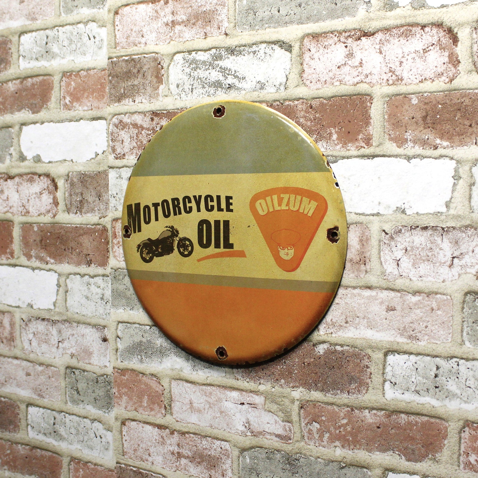 We do too. That’s why we don’t cut corners. This Motorcycle Oil Oilzum 12” Porcelain Sign is built exactly like the originals—real kiln-fired porcelain enamel, layered onto ¼-inch heavy-gauge steel for a finish that lasts a lifetime.