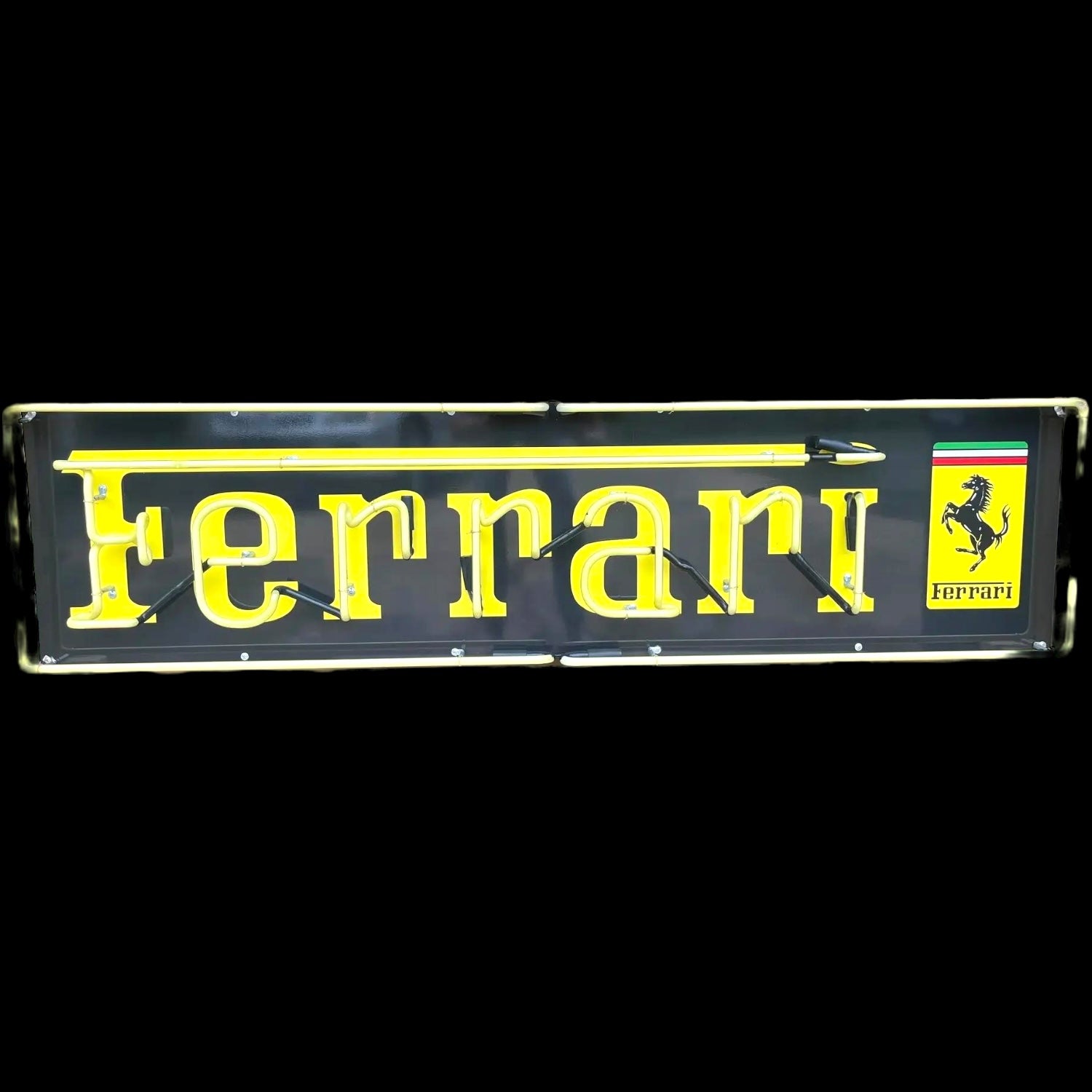 Ferrari signage has always stood apart — bold, unmistakable, and built to match the energy of the cars themselves. This green and yellow Ferrari neon panel brings that heritage forward in a striking colorway collectors rarely see. The bright yellow Ferrari script glows across a rich green panel, framed in crisp neon that makes the entire sign feel like a vintage European dealership display.