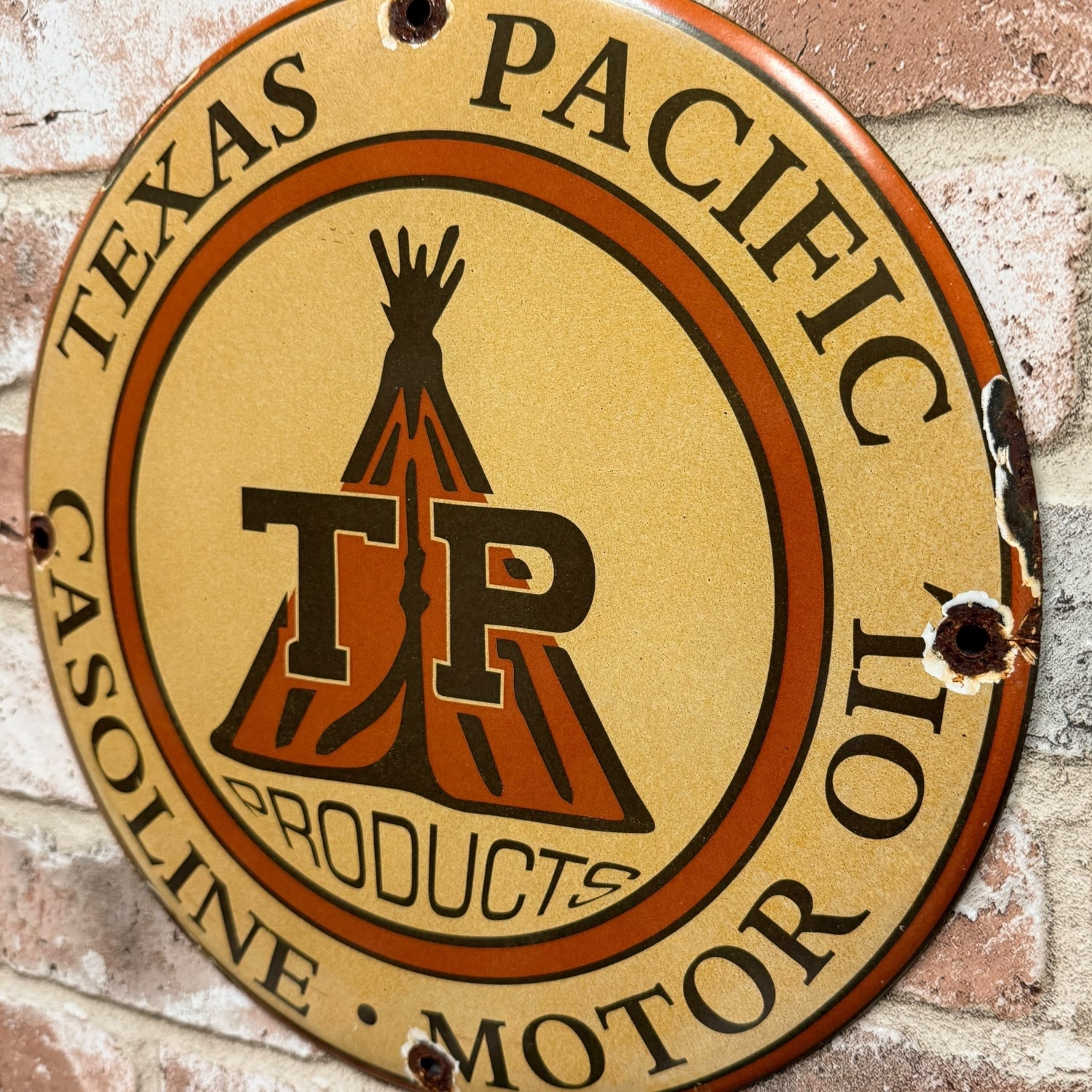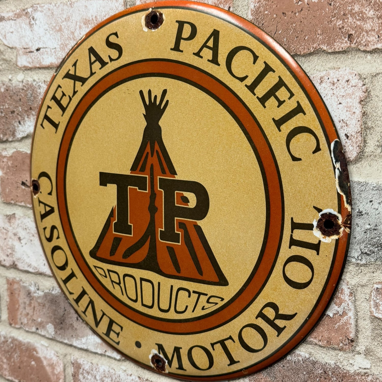 Texas Pacific TP Gasoline Motor Oil Porcelain Enamel Sign (12in)