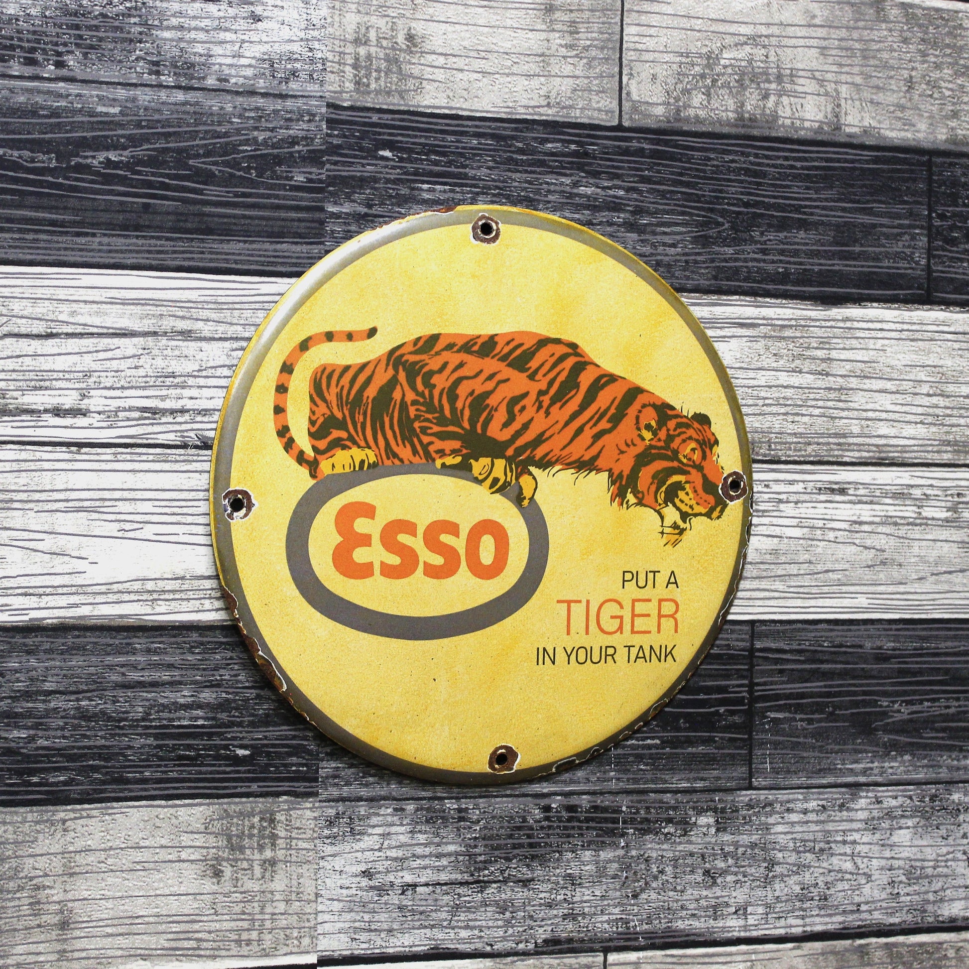 Back when advertising had bite, Esso's legendary tiger roared its way into America’s hearts—and fuel tanks. With its unforgettable slogan and fierce feline mascot, Esso captured the thrill of the open road and the promise of performance. This sign brings it all back: the bold red tiger, classic oval logo, and vintage patina that feels like it came right off an old filling station wall.